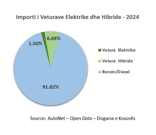 Në vitin 2024, vetëm 1.5% e veturave të importuara në Kosovë ishin elektrike, ndërsa 6.69% ishin hibride. Në total, automjetet me energji alternative përbëjnë vetëm 8.19% të importeve – një përqindje dukshëm e ulët krahasuar me vendet e rajonit